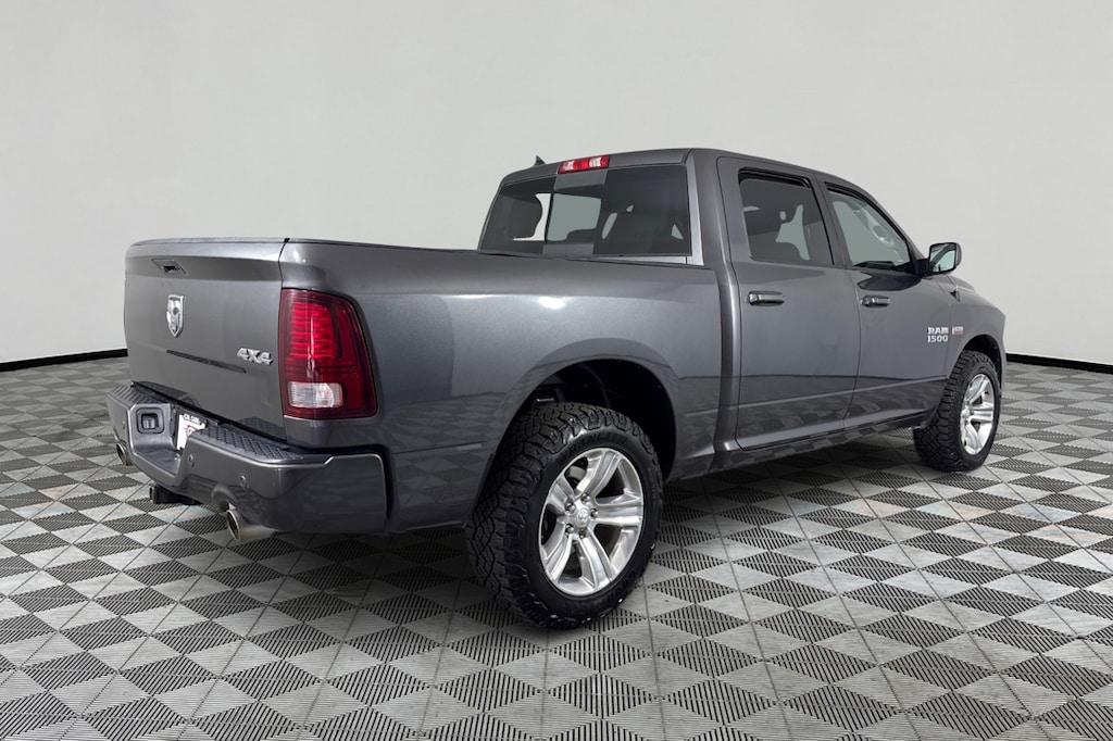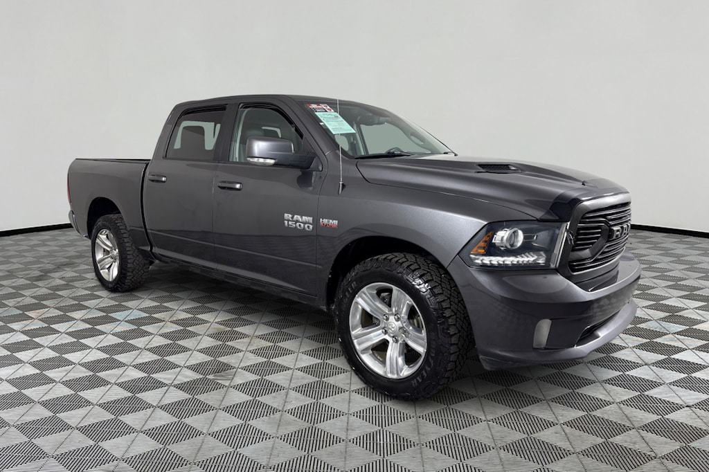 Granite Crystal Metallic exterior and Black interior, Sport trim. EPA 23 MPG Hwy/16 MPG City! Nav System, Apple CarPlay®, iPod/MP3 Input, 4x4, Aluminum Wheels, Hitch, PARKVIEW REAR BACK-UP CAMERA, PARK-SENSE REAR PARK ASSIST SYSTEM, RADIO: UCONNECT 4C NAV W/8.4 DISPLAY... ENGINE: 5.7L HEMI VVT V8 W/FUELSAVER.. TRANSMISSION: 8-SPEED TORQUEFLITE AUT... REMOTE START & SECURITY ALARM GROUP, CLASS IV HITCH RECEIVER. SEE MORE! KEY FEATURES INCLUDE 4x4, iPod/MP3 Input, Aluminum Wheels, Apple CarPlay® MP3 Player, Keyless Entry, Privacy Glass, Steering Wheel Controls, Child Safety Locks. OPTION PACKAGES CLASS IV HITCH RECEIVER, REMOTE START & SECURITY ALARM GROUP Remote Start System, Security Alarm, TRANSMISSION: 8-SPEED TORQUEFLITE AUTOMATIC (DFD) (STD), ENGINE: 5.7L HEMI VVT V8 W/FUELSAVER MDS (STD), RADIO: UCONNECT 4C NAV W/8.4 DISPLAY SiriusXM Traffic, HD Radio, GPS Navigation, SiriusXM Travel Link, Uconnect Access, PARK-SENSE REAR PARK ASSIST SYSTEM, PARKVIEW REAR BACK-UP CAMERA. Ram Sport with Granite Crystal Metallic exterior and Black interior features a 8 Cylinder Engine with 305 HP at 6400 RPM*. EXPERTS ARE SAYING KBB.com explains . the 2018 Ram 1500 is an extremely capable and comfortable full-size pickup thats ready to work, tow or play.. Great Gas Mileage: 23 MPG Hwy. A GREAT VALUE Was $26,995. Approx. Original Base Sticker Price: $44,600*. .
